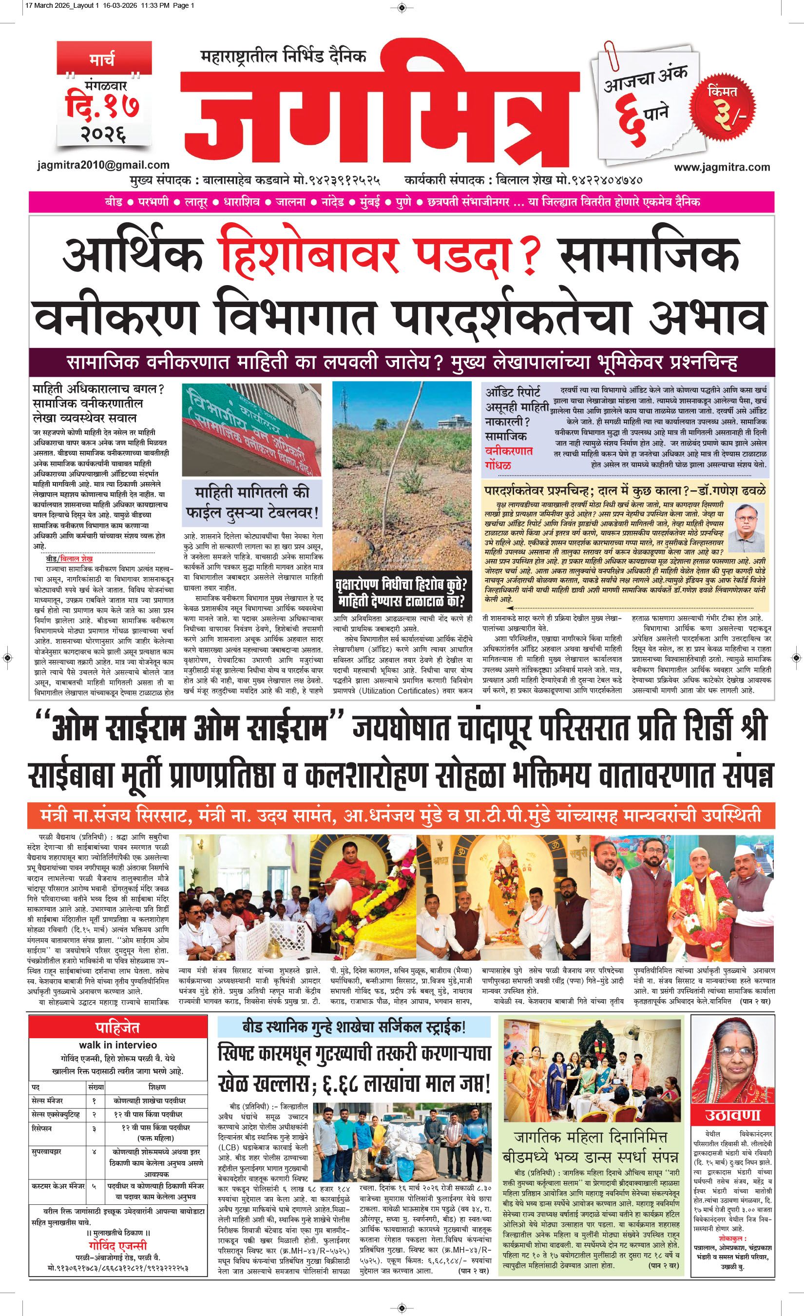 मुख्य संपादक : बालासाहेब कडबाने, कार्यकारी संपादक : बिलाल शेख - कार्यालय :- जगमित्र, बाजी प्रभु नगर जवळ, नेहरू चौक, परळी वै. ता.परळी वै. जि.बीड (महाराष्ट्र) मो.9423912525, 9822974925,jagmitra2010@gmail.com पहिले पान दुसरे पान तिसरे पान चौथे पान पाचवे पान सहावे पान सातवे पान आठवे पान Visitor Counter free online counter Monday, 16 March 2026