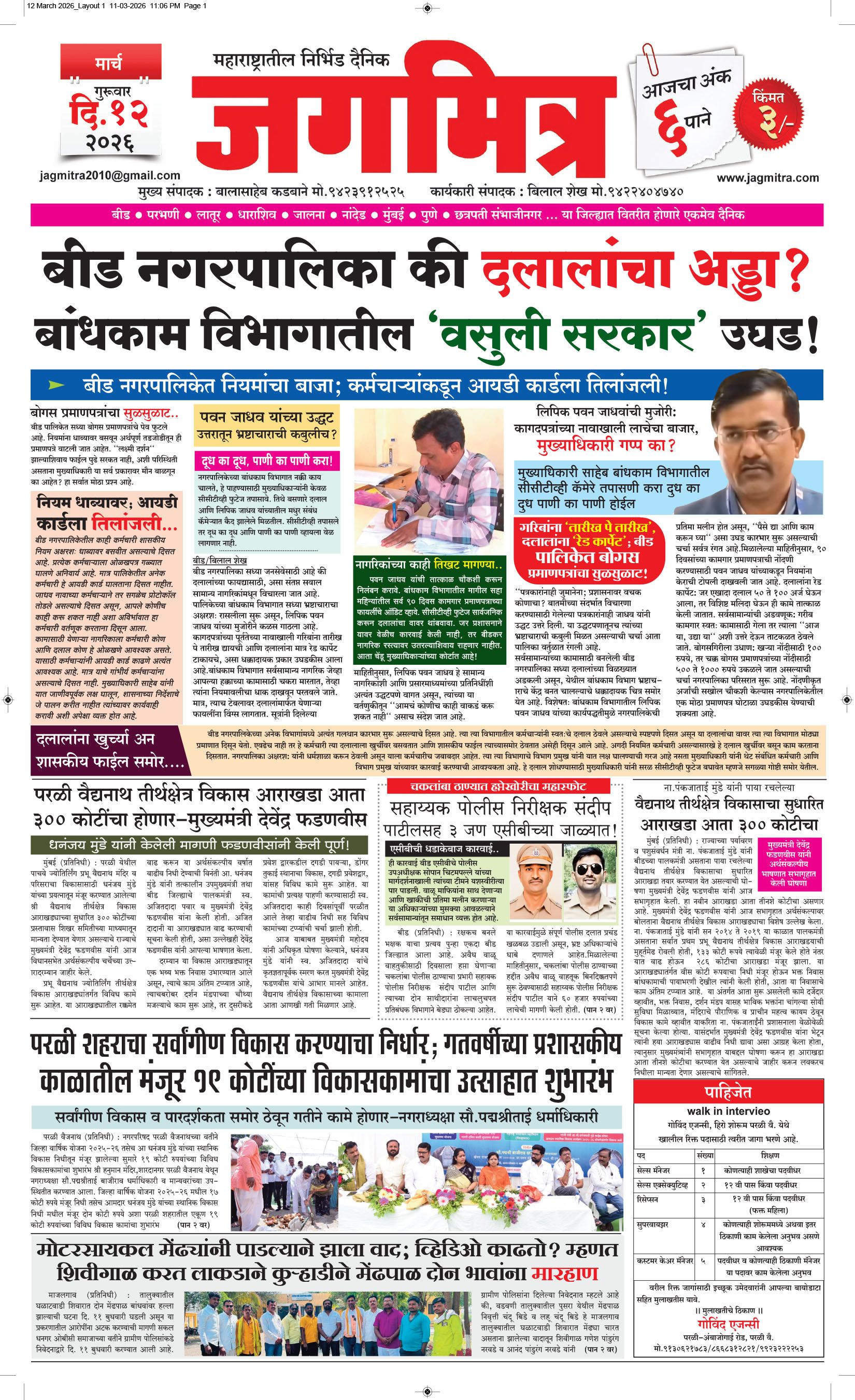 मुख्य संपादक : बालासाहेब कडबाने, कार्यकारी संपादक : बिलाल शेख - कार्यालय :- जगमित्र, बाजी प्रभु नगर जवळ, नेहरू चौक, परळी वै. ता.परळी वै. जि.बीड (महाराष्ट्र) मो.9423912525, 9822974925,jagmitra2010@gmail.com पहिले पान दुसरे पान तिसरे पान चौथे पान पाचवे पान सहावे पान सातवे पान आठवे पान Visitor Counter free online counter Saturday, 14 March 2026