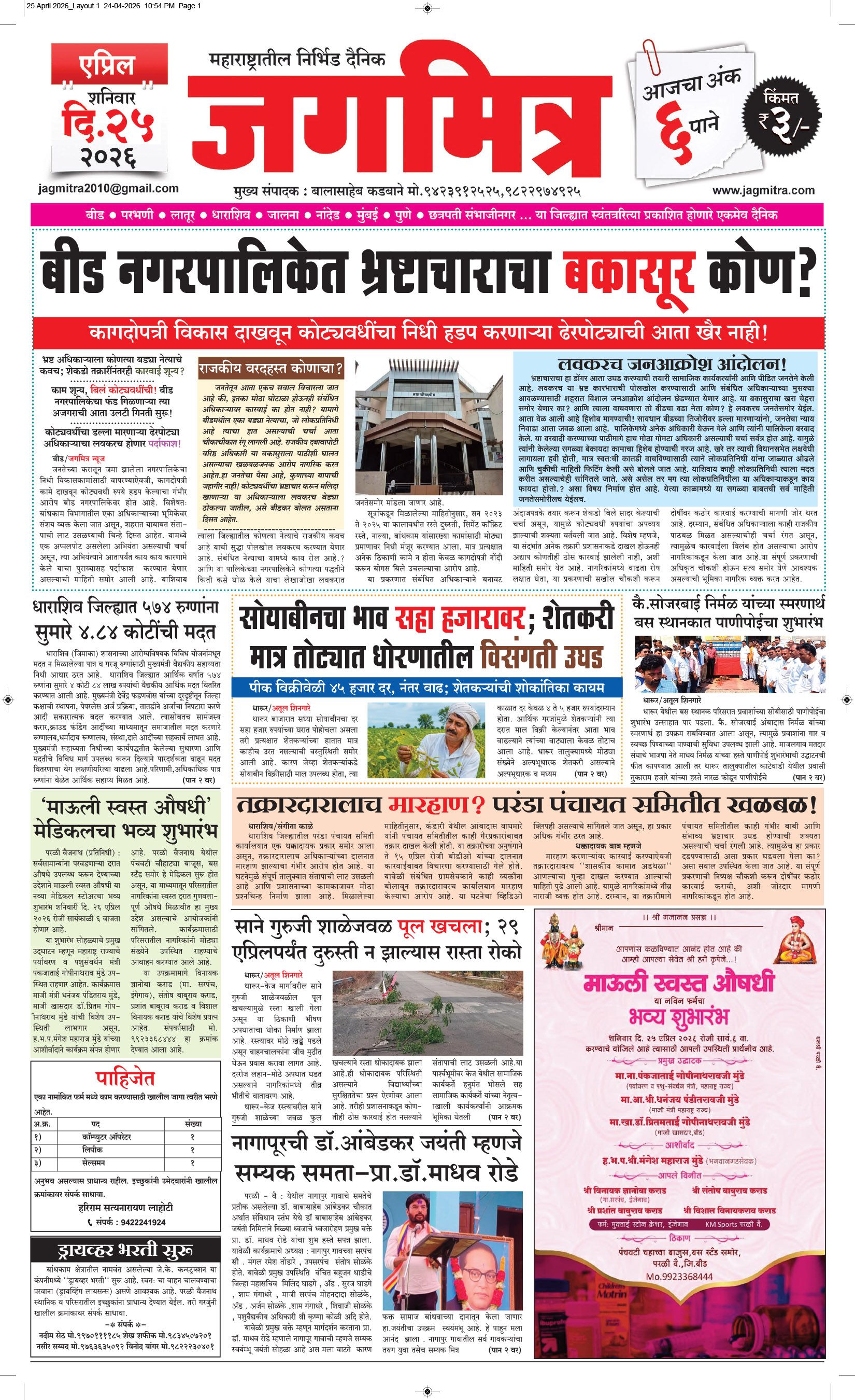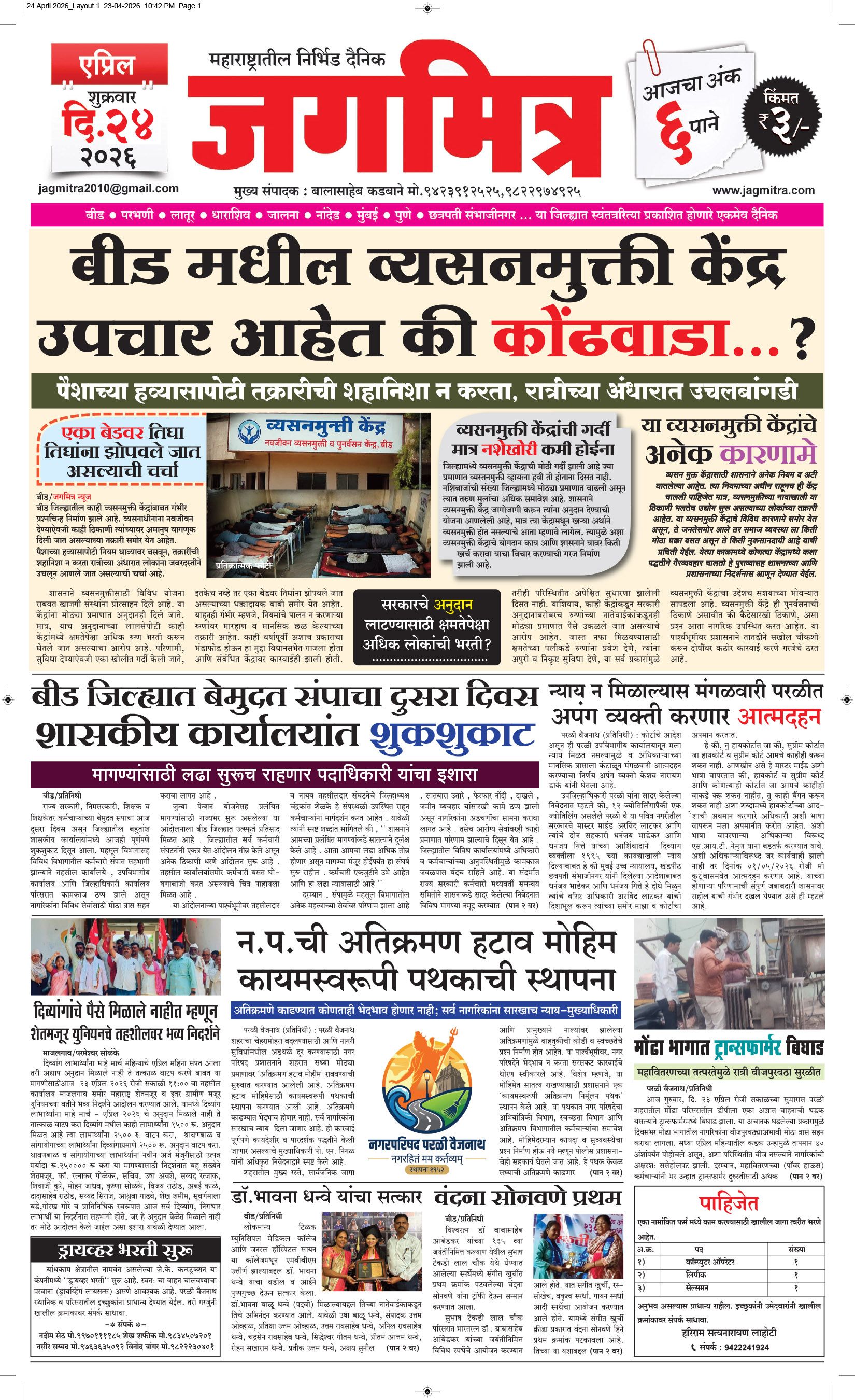 मुख्य संपादक : बालासाहेब कडबाने, कार्यकारी संपादक : बिलाल शेख - कार्यालय :- जगमित्र, बाजी प्रभु नगर जवळ, नेहरू चौक, परळी वै. ता.परळी वै. जि.बीड (महाराष्ट्र) मो.9423912525, 9822974925,jagmitra2010@gmail.com पहिले पान दुसरे पान तिसरे पान चौथे पान पाचवे पान सहावे पान सातवे पान आठवे पान Visitor Counter free online counter Friday, 24 April 2026