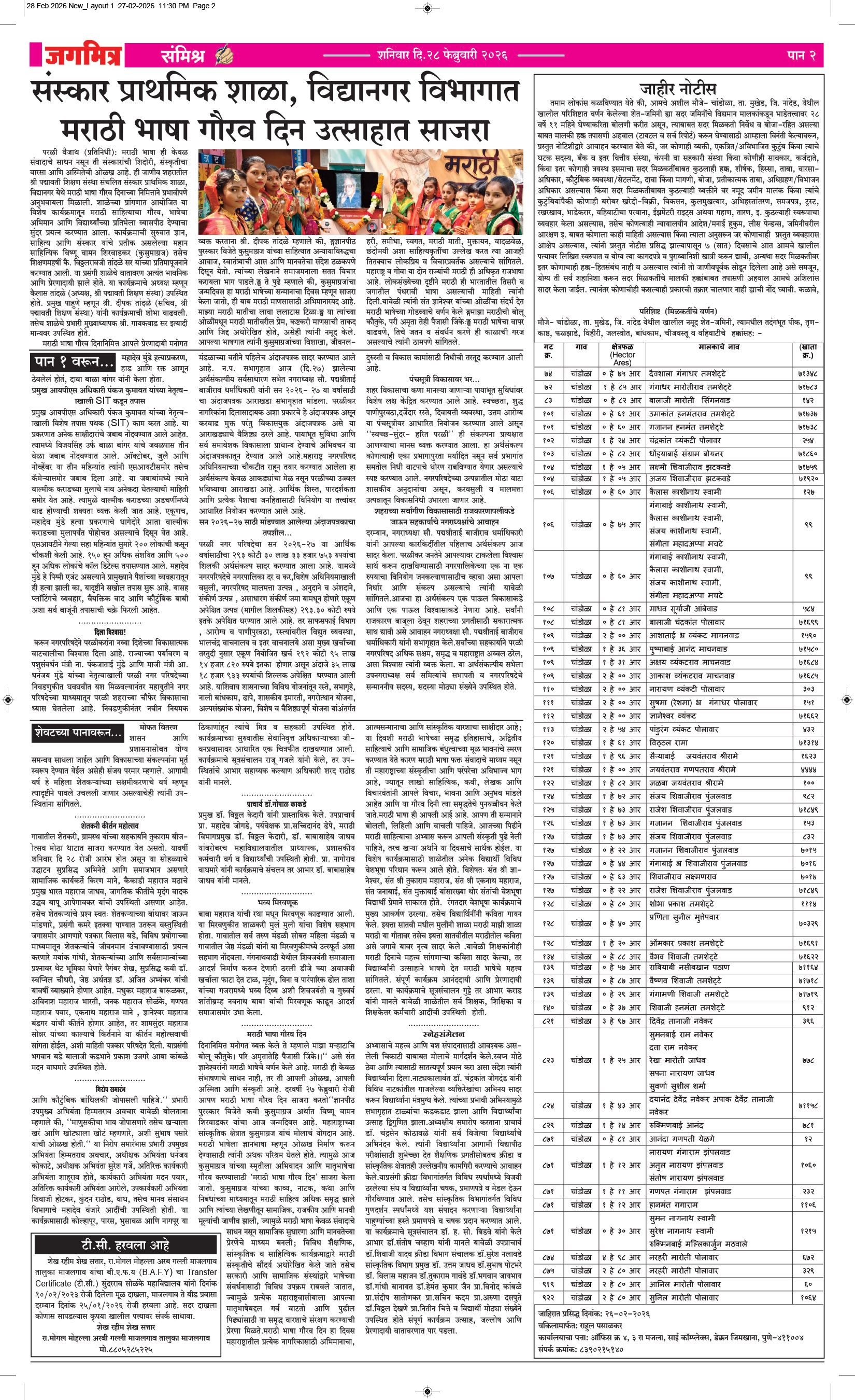 मुख्य संपादक : बालासाहेब कडबाने, कार्यकारी संपादक : बिलाल शेख - कार्यालय :- जगमित्र, बाजी प्रभु नगर जवळ, नेहरू चौक, परळी वै. ता.परळी वै. जि.बीड (महाराष्ट्र) मो.9423912525, 9822974925,jagmitra2010@gmail.com पहिले पान दुसरे पान तिसरे पान चौथे पान पाचवे पान सहावे पान सातवे पान आठवे पान Visitor Counter free online counter Sunday, 1 March 2026