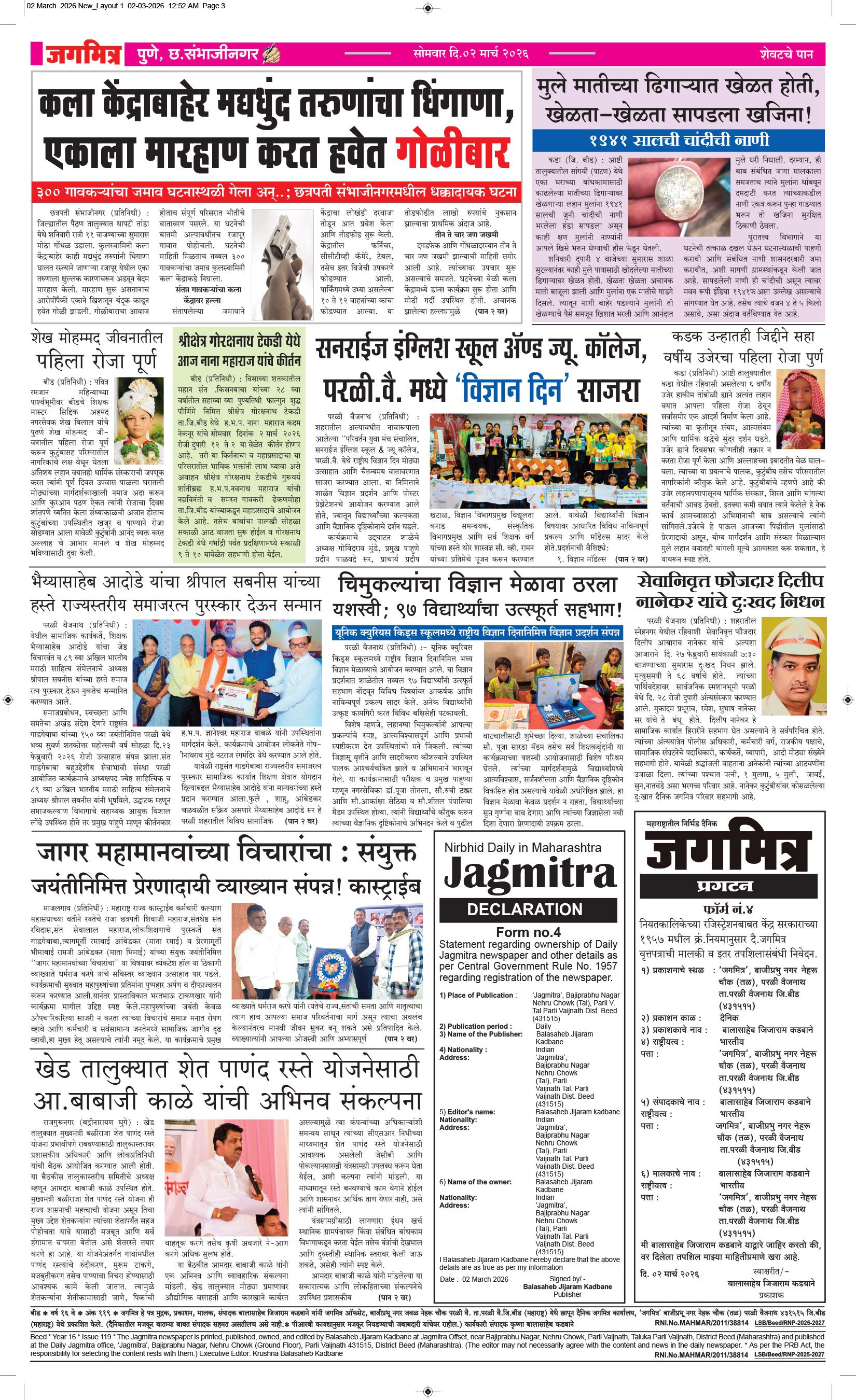 मुख्य संपादक : बालासाहेब कडबाने, कार्यकारी संपादक : बिलाल शेख - कार्यालय :- जगमित्र, बाजी प्रभु नगर जवळ, नेहरू चौक, परळी वै. ता.परळी वै. जि.बीड (महाराष्ट्र) मो.9423912525, 9822974925,jagmitra2010@gmail.com पहिले पान दुसरे पान तिसरे पान चौथे पान पाचवे पान सहावे पान सातवे पान आठवे पान Visitor Counter free online counter Monday, 2 March 2026