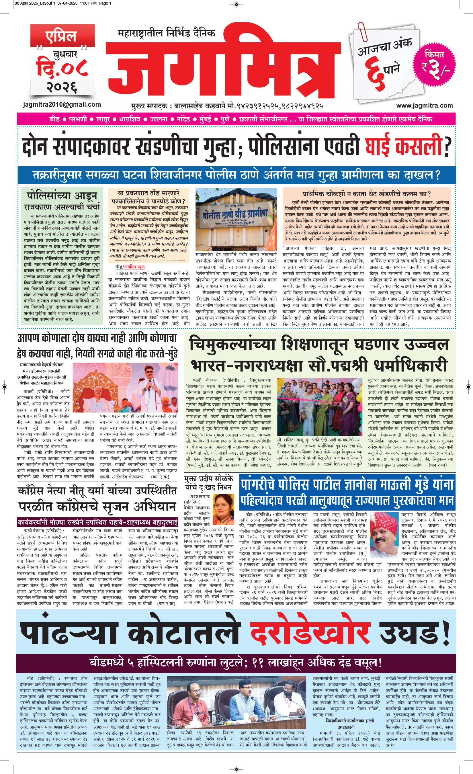 मुख्य संपादक : बालासाहेब कडबाने, कार्यकारी संपादक : बिलाल शेख - कार्यालय :- जगमित्र, बाजी प्रभु नगर जवळ, नेहरू चौक, परळी वै. ता.परळी वै. जि.बीड (महाराष्ट्र) मो.9423912525, 9822974925,[email protected] पहिले पान दुसरे पान तिसरे पान चौथे पान पाचवे पान सहावे पान सातवे पान आठवे पान Visitor Counter free online counter Wednesday, 8 April 2026