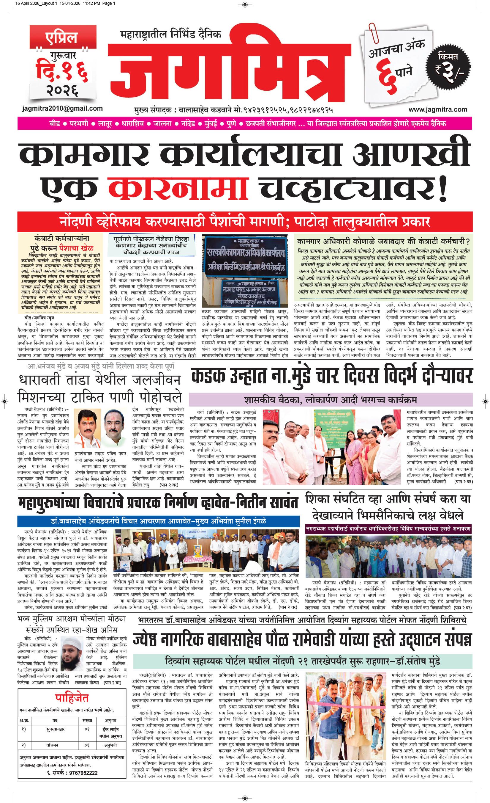 मुख्य संपादक : बालासाहेब कडबाने, कार्यकारी संपादक : बिलाल शेख - कार्यालय :- जगमित्र, बाजी प्रभु नगर जवळ, नेहरू चौक, परळी वै. ता.परळी वै. जि.बीड (महाराष्ट्र) मो.9423912525, 9822974925,[email protected] पहिले पान दुसरे पान तिसरे पान चौथे पान पाचवे पान सहावे पान सातवे पान आठवे पान Visitor Counter free online counter Thursday, 16 April 2026