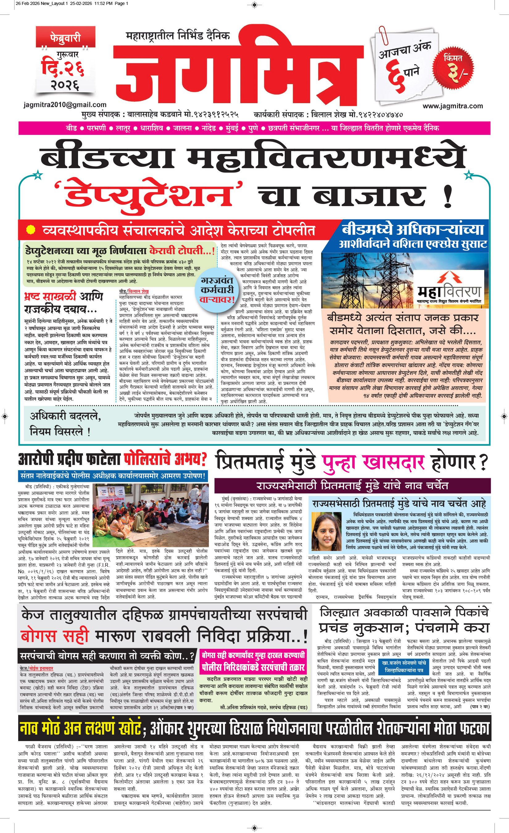 मुख्य संपादक : बालासाहेब कडबाने, कार्यकारी संपादक : बिलाल शेख - कार्यालय :- जगमित्र, बाजी प्रभु नगर जवळ, नेहरू चौक, परळी वै. ता.परळी वै. जि.बीड (महाराष्ट्र) मो.9423912525, 9822974925,[email protected] पहिले पान दुसरे पान तिसरे पान चौथे पान पाचवे पान सहावे पान सातवे पान आठवे पान Visitor Counter free online counter Thursday, 26 February 2026