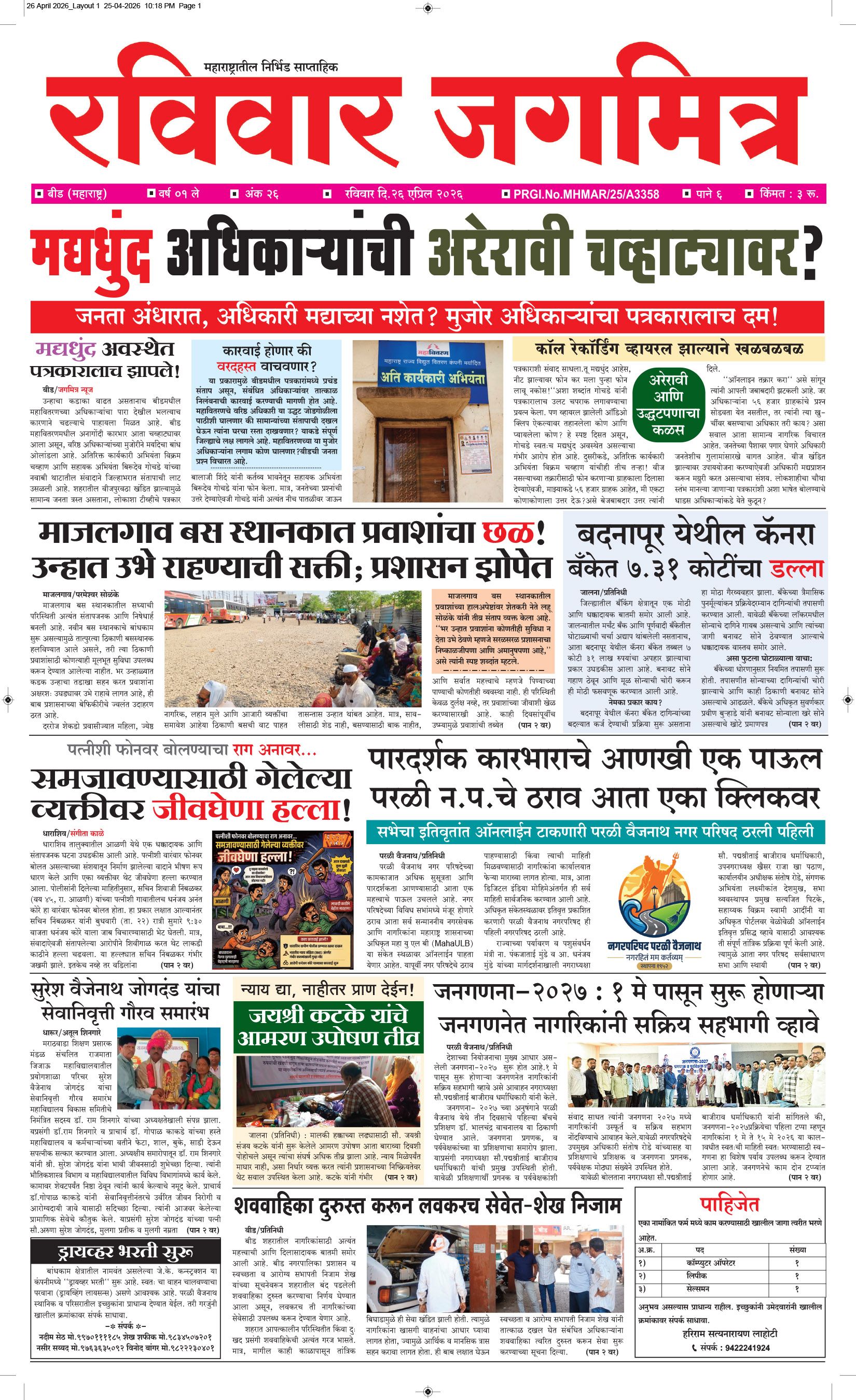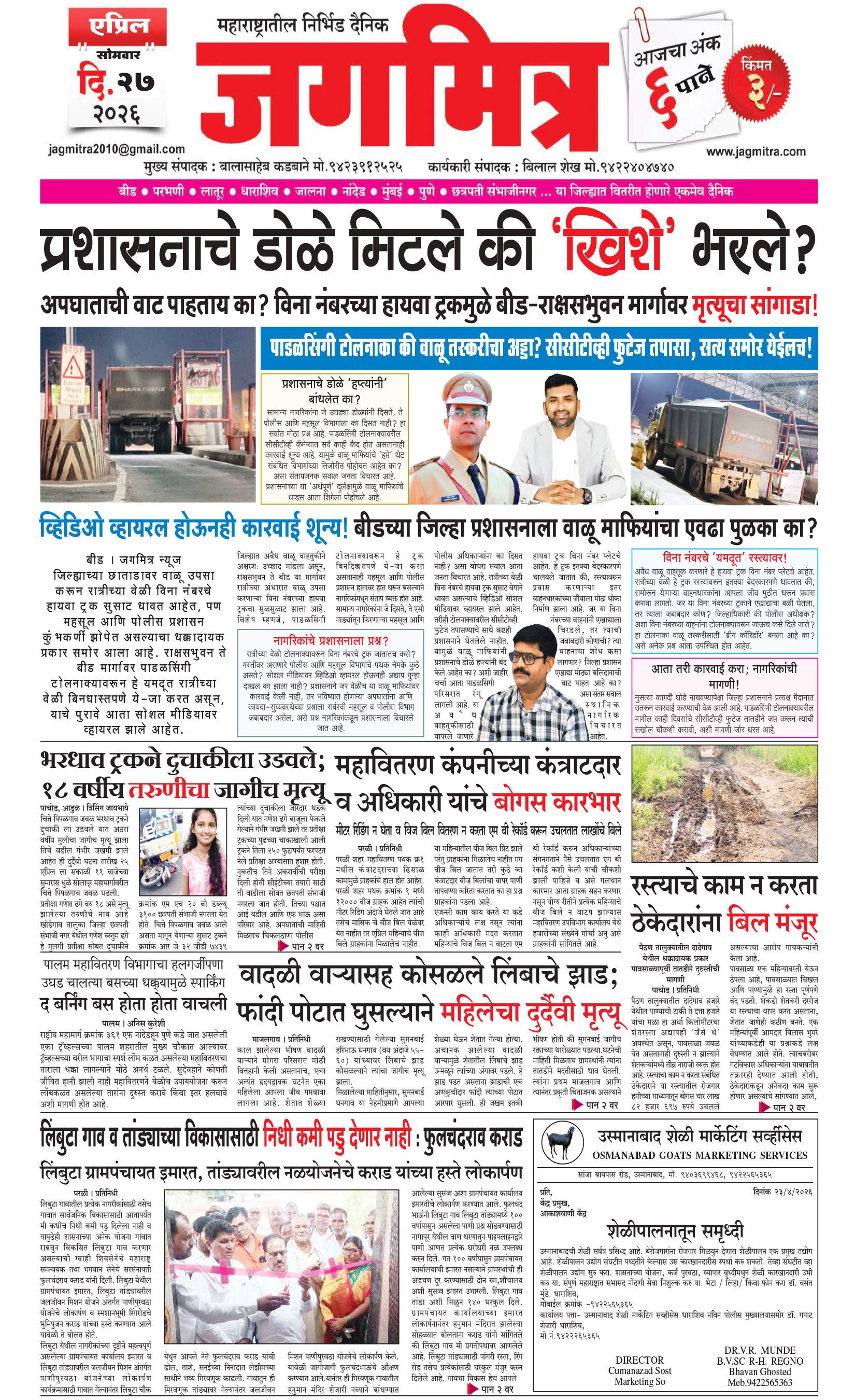 मुख्य संपादक : बालासाहेब कडबाने, कार्यकारी संपादक : बिलाल शेख - कार्यालय :- जगमित्र, बाजी प्रभु नगर जवळ, नेहरू चौक, परळी वै. ता.परळी वै. जि.बीड (महाराष्ट्र) मो.9423912525, 9822974925,[email protected] पहिले पान दुसरे पान तिसरे पान चौथे पान पाचवे पान सहावे पान सातवे पान आठवे पान Visitor Counter free online counter Sunday, 26 April 2026