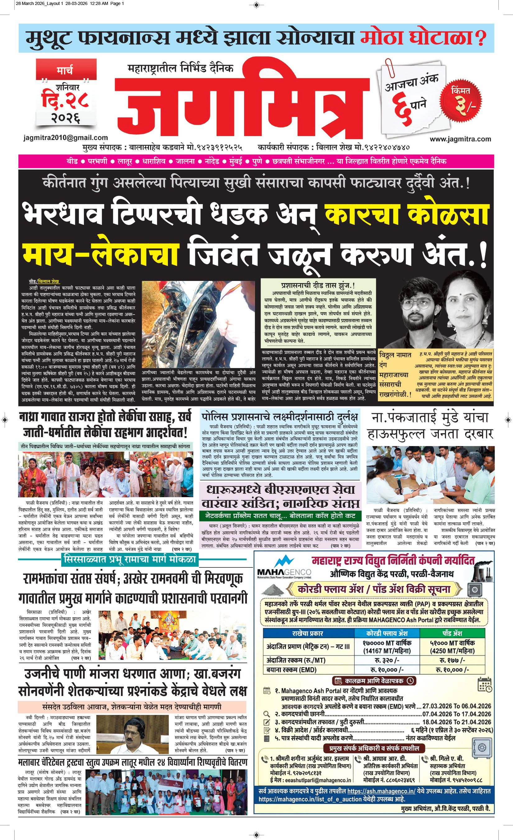 मुख्य संपादक : बालासाहेब कडबाने, कार्यकारी संपादक : बिलाल शेख - कार्यालय :- जगमित्र, बाजी प्रभु नगर जवळ, नेहरू चौक, परळी वै. ता.परळी वै. जि.बीड (महाराष्ट्र) मो.9423912525, 9822974925,[email protected] पहिले पान दुसरे पान तिसरे पान चौथे पान पाचवे पान सहावे पान सातवे पान आठवे पान Visitor Counter free online counter Saturday, 28 March 2026