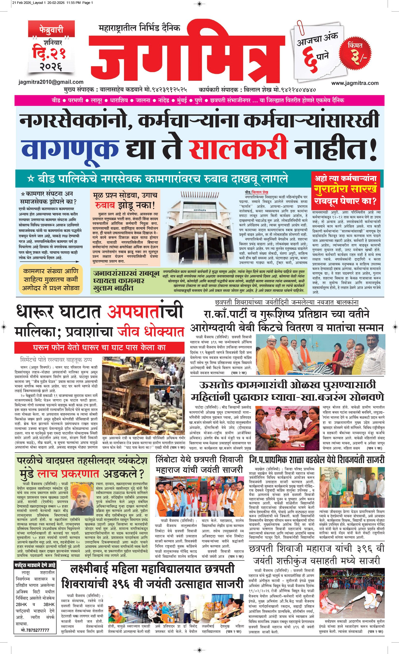 मुख्य संपादक : बालासाहेब कडबाने, कार्यकारी संपादक : बिलाल शेख - कार्यालय :- जगमित्र, बाजी प्रभु नगर जवळ, नेहरू चौक, परळी वै. ता.परळी वै. जि.बीड (महाराष्ट्र) मो.9423912525, 9822974925,[email protected] पहिले पान दुसरे पान तिसरे पान चौथे पान पाचवे पान सहावे पान सातवे पान आठवे पान Visitor Counter free online counter Saturday, 21 February 2026
