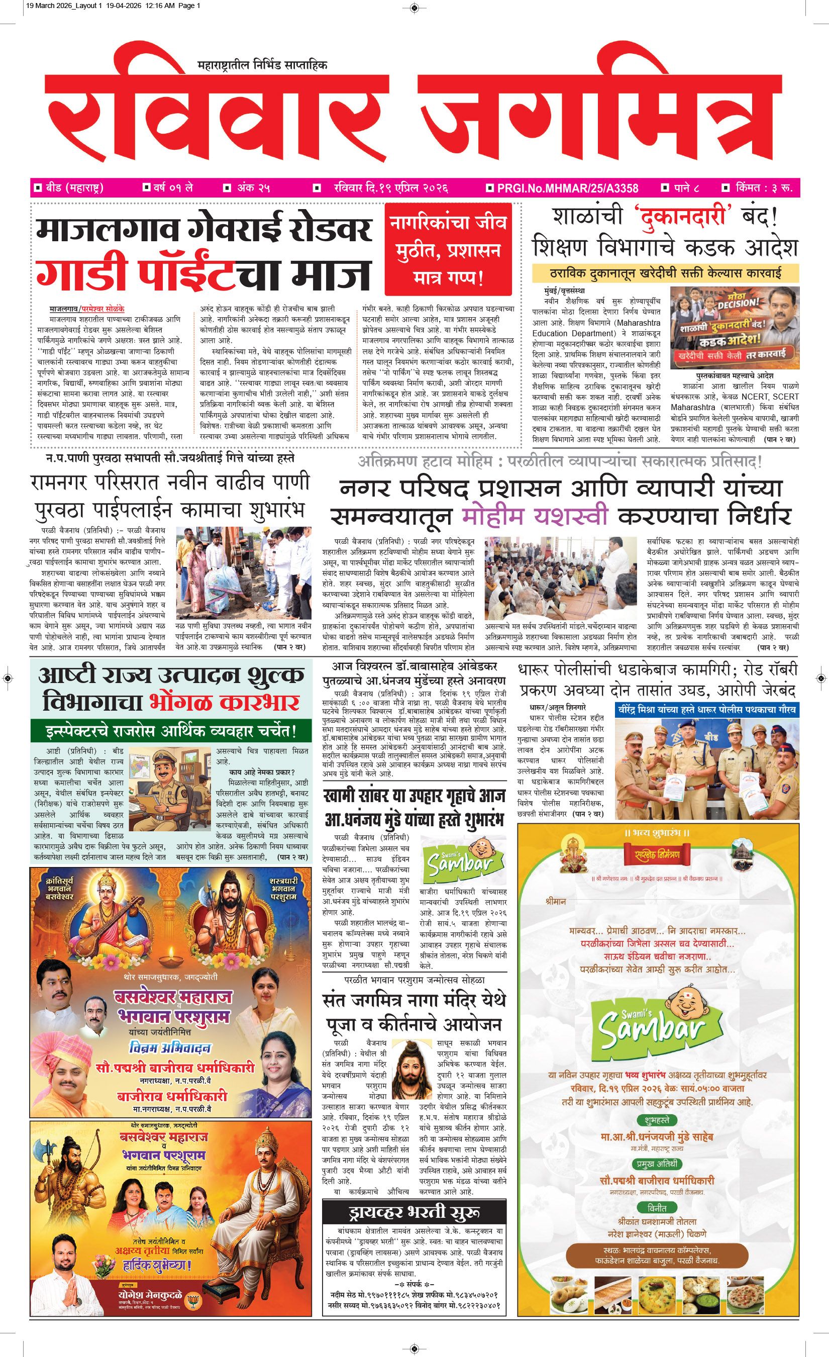 मुख्य संपादक : बालासाहेब कडबाने, कार्यकारी संपादक : बिलाल शेख - कार्यालय :- जगमित्र, बाजी प्रभु नगर जवळ, नेहरू चौक, परळी वै. ता.परळी वै. जि.बीड (महाराष्ट्र) मो.9423912525, 9822974925,[email protected] पहिले पान दुसरे पान तिसरे पान चौथे पान पाचवे पान सहावे पान सातवे पान आठवे पान Visitor Counter free online counter Sunday, 19 April 2026