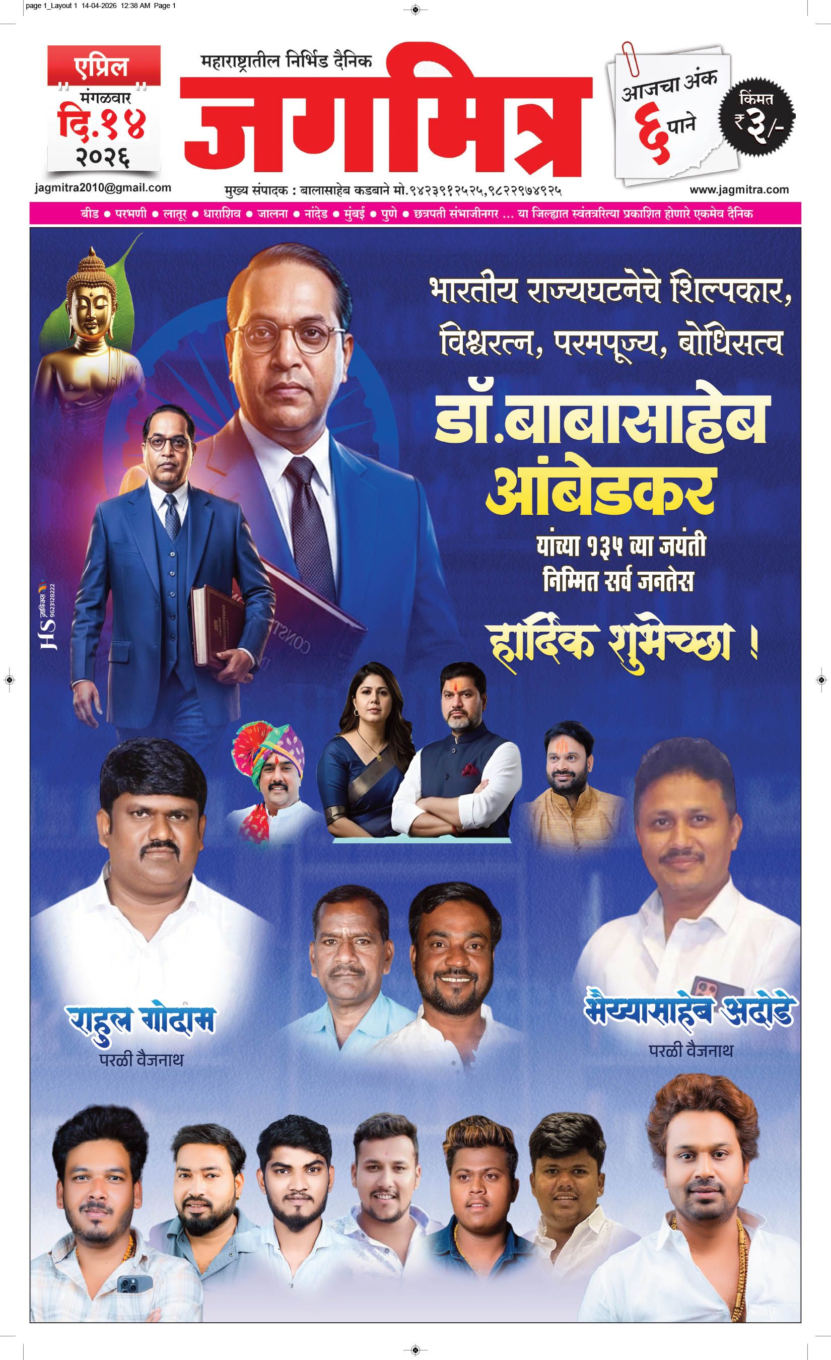 मुख्य संपादक : बालासाहेब कडबाने, कार्यकारी संपादक : बिलाल शेख - कार्यालय :- जगमित्र, बाजी प्रभु नगर जवळ, नेहरू चौक, परळी वै. ता.परळी वै. जि.बीड (महाराष्ट्र) मो.9423912525, 9822974925,[email protected] पहिले पान दुसरे पान तिसरे पान चौथे पान पाचवे पान सहावे पान सातवे पान आठवे पान Visitor Counter free online counter Tuesday, 14 April 2026