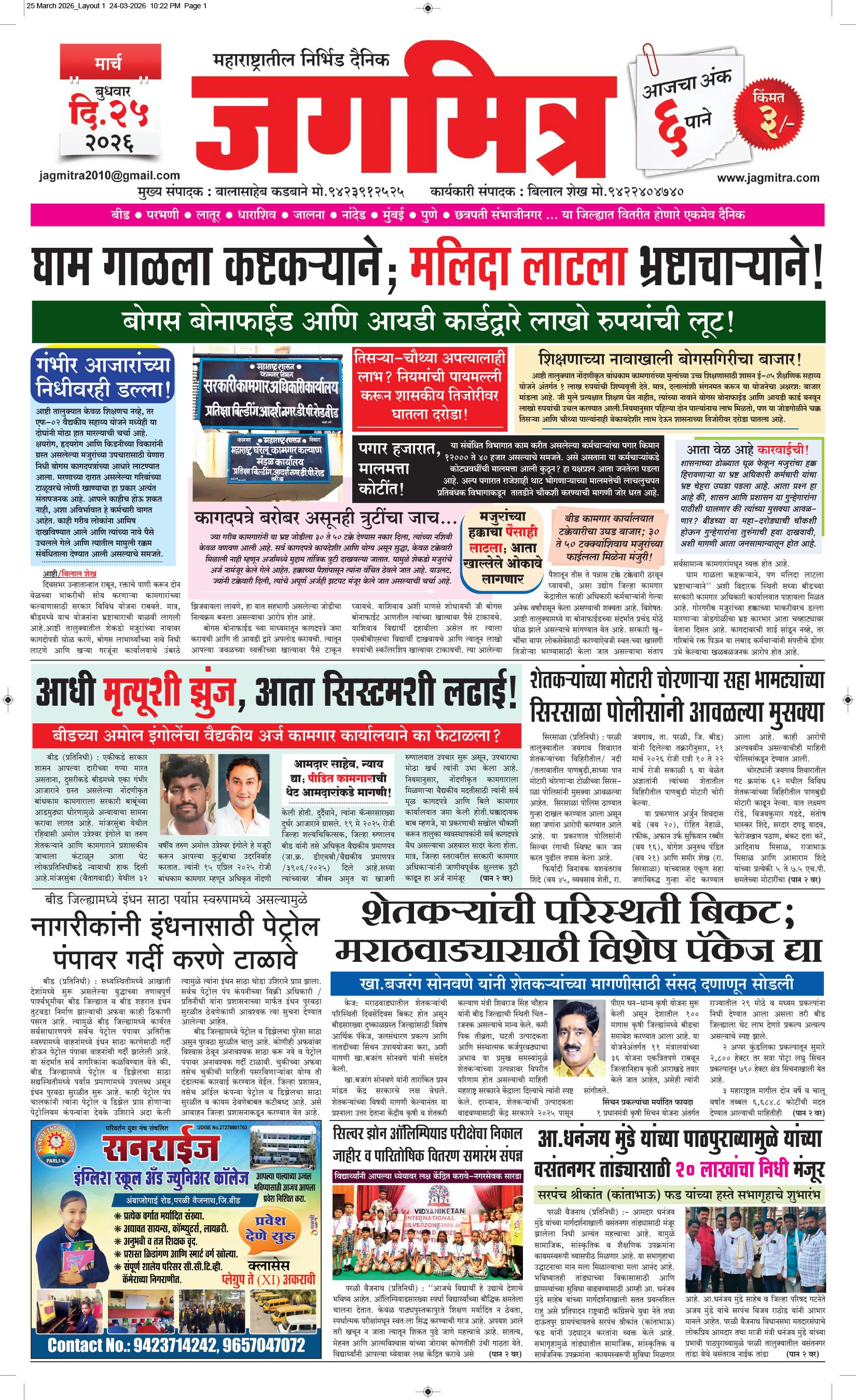 मुख्य संपादक : बालासाहेब कडबाने, कार्यकारी संपादक : बिलाल शेख - कार्यालय :- जगमित्र, बाजी प्रभु नगर जवळ, नेहरू चौक, परळी वै. ता.परळी वै. जि.बीड (महाराष्ट्र) मो.9423912525, 9822974925,[email protected] पहिले पान दुसरे पान तिसरे पान चौथे पान पाचवे पान सहावे पान सातवे पान आठवे पान Visitor Counter free online counter Wednesday, 25 March 2026