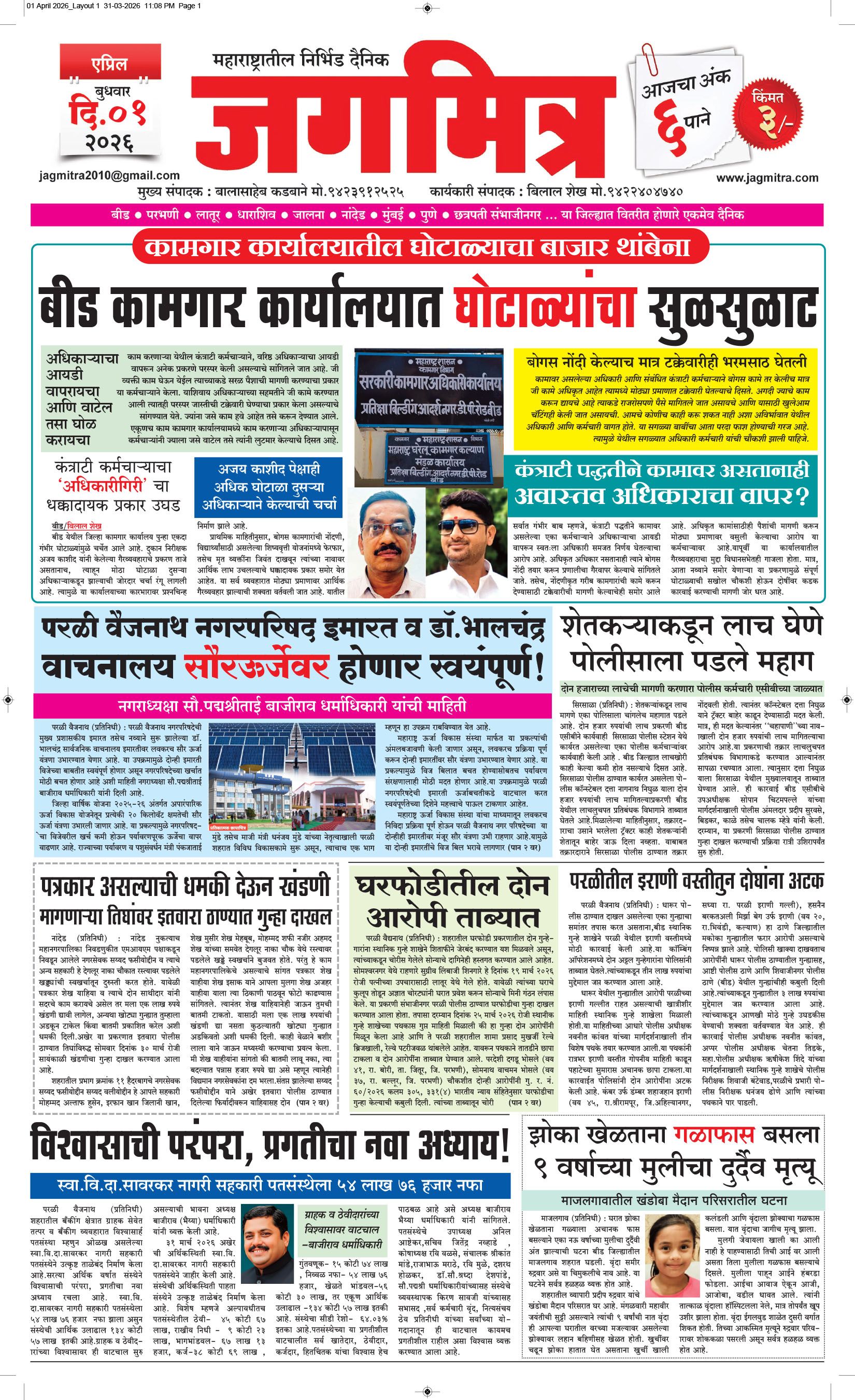 मुख्य संपादक : बालासाहेब कडबाने, कार्यकारी संपादक : बिलाल शेख - कार्यालय :- जगमित्र, बाजी प्रभु नगर जवळ, नेहरू चौक, परळी वै. ता.परळी वै. जि.बीड (महाराष्ट्र) मो.9423912525, 9822974925,[email protected] पहिले पान दुसरे पान तिसरे पान चौथे पान पाचवे पान सहावे पान सातवे पान आठवे पान Visitor Counter free online counter Wednesday, 1 April 2026