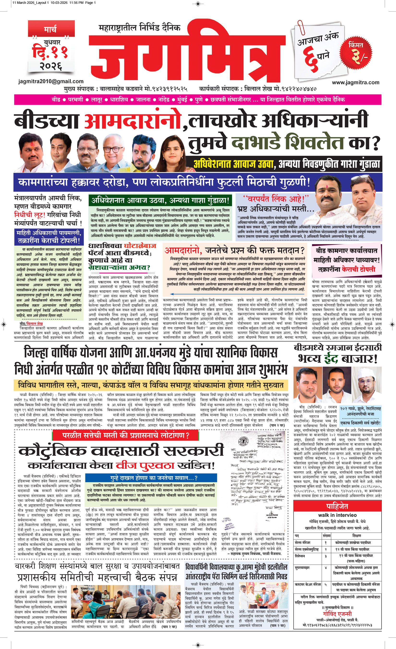 मुख्य संपादक : बालासाहेब कडबाने, कार्यकारी संपादक : बिलाल शेख - कार्यालय :- जगमित्र, बाजी प्रभु नगर जवळ, नेहरू चौक, परळी वै. ता.परळी वै. जि.बीड (महाराष्ट्र) मो.9423912525, 9822974925,[email protected] पहिले पान दुसरे पान तिसरे पान चौथे पान पाचवे पान सहावे पान सातवे पान आठवे पान Visitor Counter free online counter Wednesday, 11 March 2026
