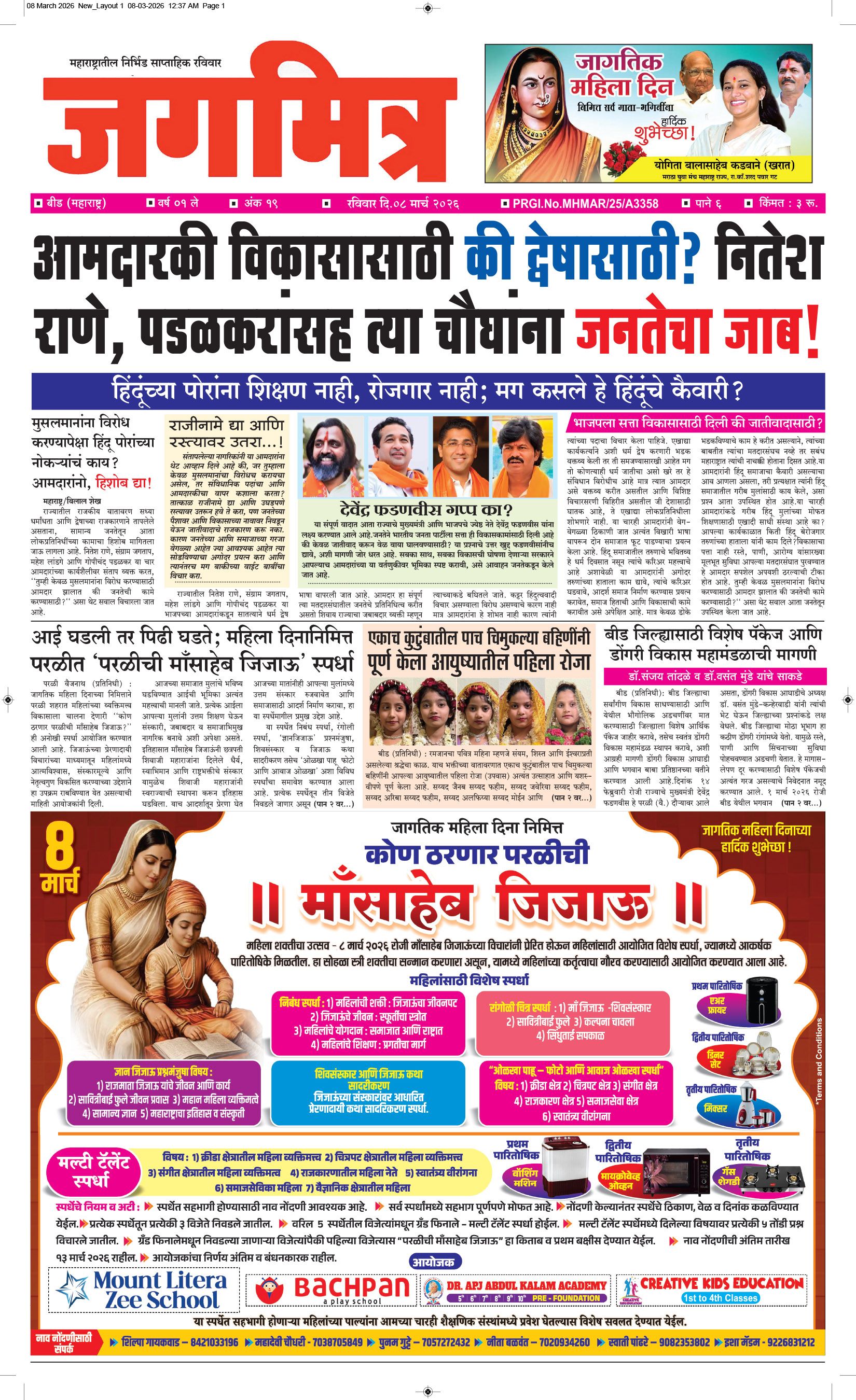 मुख्य संपादक : बालासाहेब कडबाने, कार्यकारी संपादक : बिलाल शेख - कार्यालय :- जगमित्र, बाजी प्रभु नगर जवळ, नेहरू चौक, परळी वै. ता.परळी वै. जि.बीड (महाराष्ट्र) मो.9423912525, 9822974925,[email protected] पहिले पान दुसरे पान तिसरे पान चौथे पान पाचवे पान सहावे पान सातवे पान आठवे पान Visitor Counter free online counter Saturday, 7 March 2026